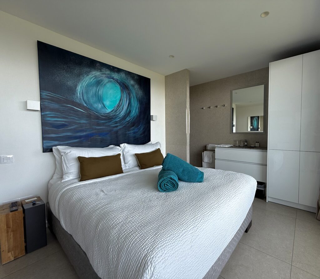 Vous trouverez à votre disposition une machine Nespresso Vertuo avec 4 capsules de café, un mini-bar, et un accès WIFI. Cette chambre climatisée est composée d’un lit Queen Size (160/200) entouré d'une part part par une commode et d'autre part d'un porte-manteaux design, d’une télévision 36 pouces avec chaines françaises et étrangères ainsi que d’une salle d’eau ouverte sur la chambre avec vue mer et douche italienne et des WC indépendants.